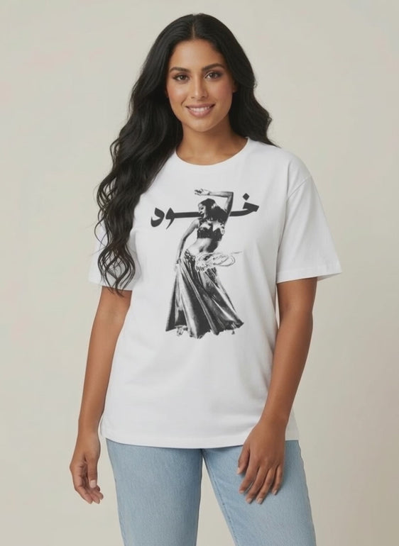 Celebrate the timeless elegance and comedic brilliance of Hind Rostom with our exclusive Mishmish tribute collection. This stunning women's t-shirt honors one of Egyptian cinema's most beloved and versatile actresses, whose unforgettable performances and iconic roles have captivated audiences for decades.